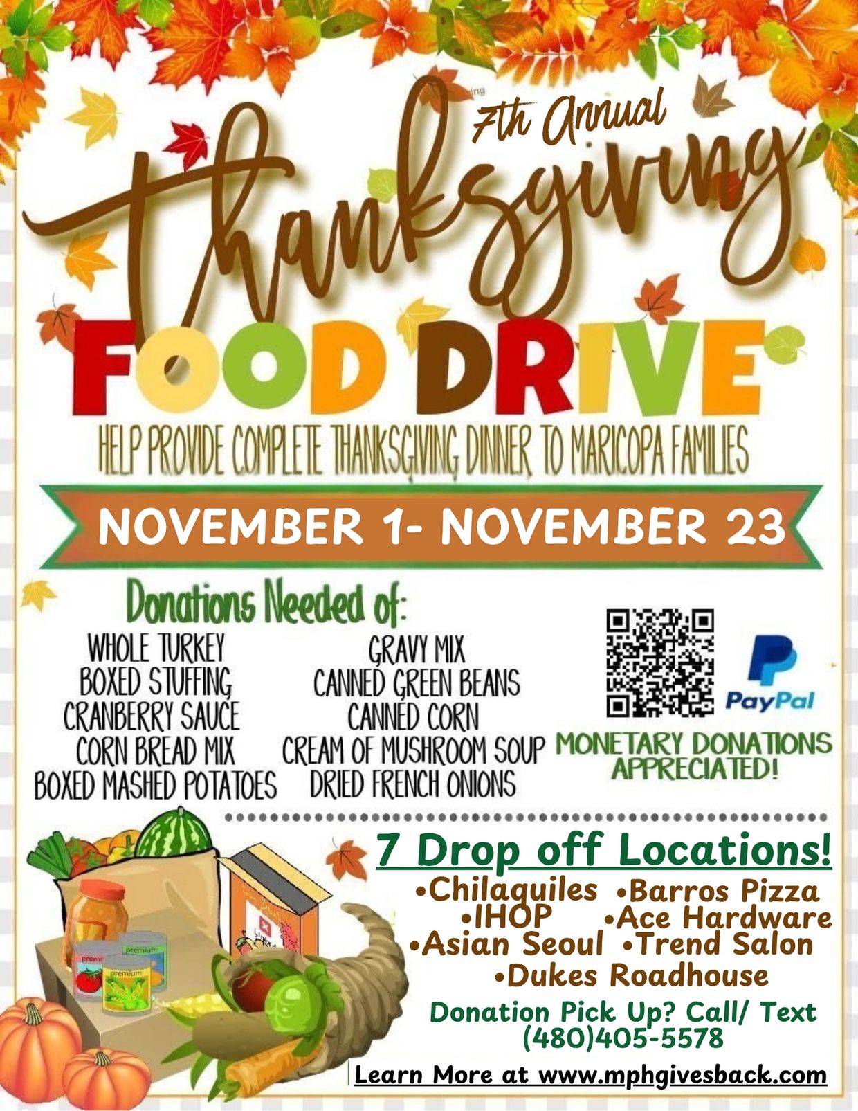 Maricopa families can register to receive a complete Thanksgiving meal by registering in advance. Boxes will be distributed on 11/24-11/26